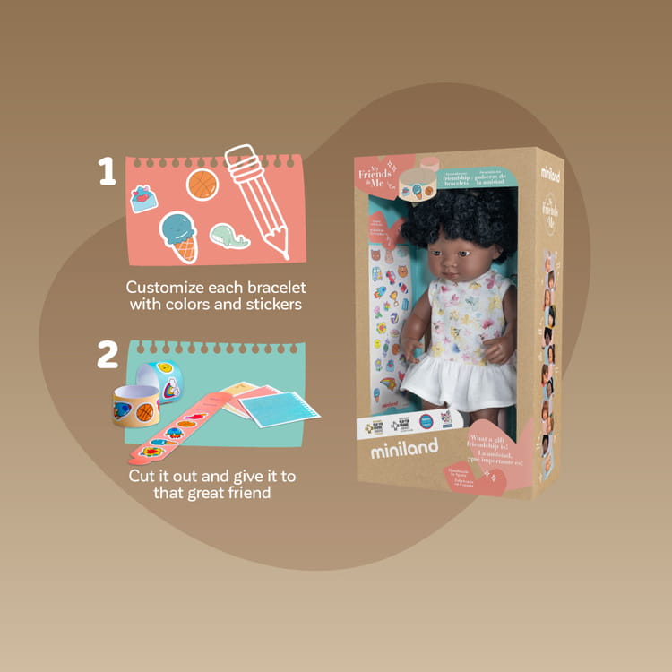 Odkryj magię przyjaźni z 38-centymetrową lalką afrykanką My Friends & Me z nowej kolekcji lalek Miniland. Ta urocza lalka dla dziewczynek i chłopców nie tylko promuje wartość przyjaźni, ale także radość dzielenia się wyjątkowymi chwilami z innymi dziećmi od najmłodszych lat.